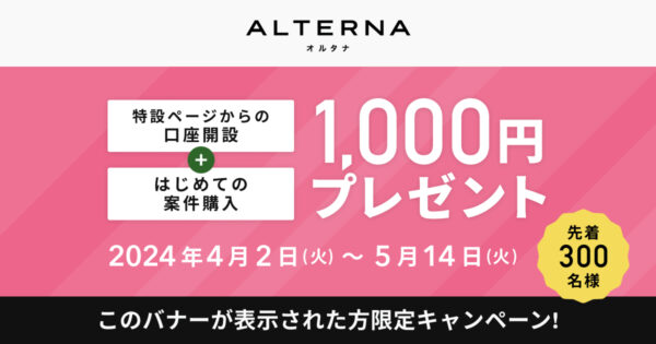 なお、ALTERNA(オルタナ)が提供する金融商品は元本保証や将来の投資成果を保証するものではありません。